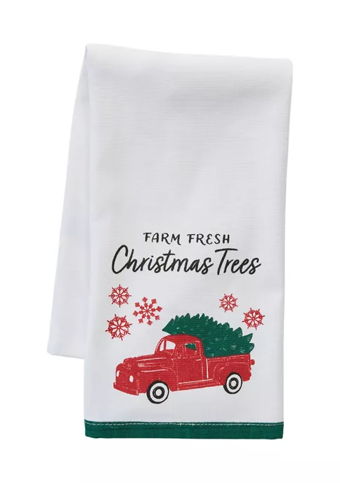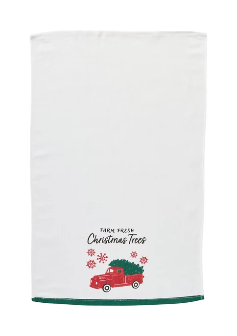 Decorate your kitchen for the holidays with this festive kitchen towel from Joyland featuring a classic red truck hauling a fluffy green Christmas tree.
