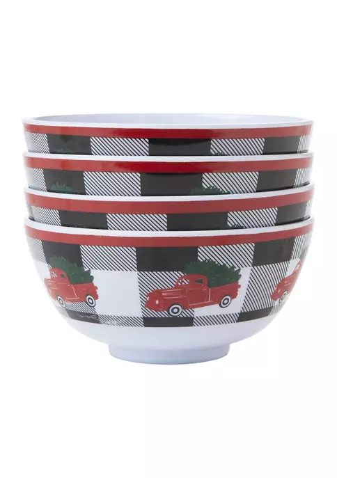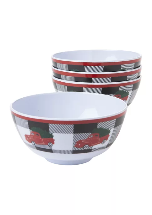 Red trucks grace a plaid ground on this set of smooth melamine holiday bowls from Joyland.
