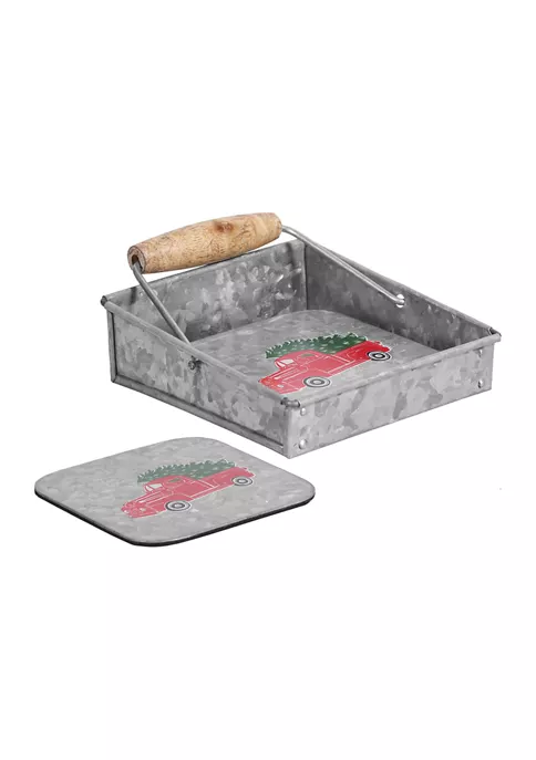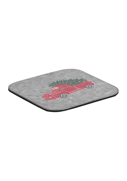 Featuring a classic red truck hauling a fluffy Christmas tree, this set of coasters with the matching holder from Joyland is an easy way to spruce up your home dΓ©cor for the holidays.