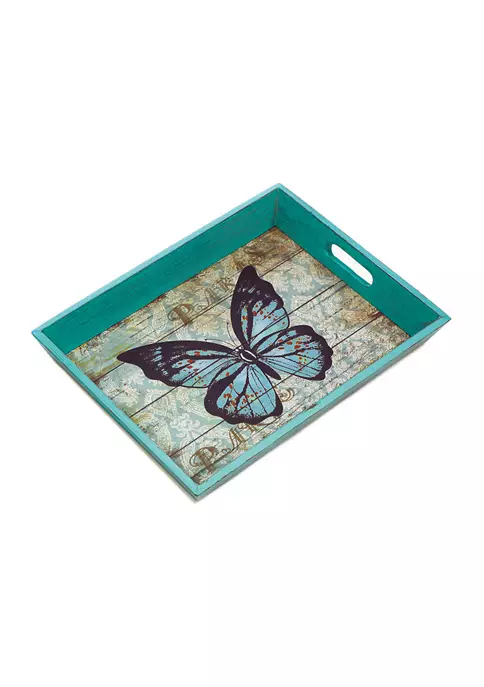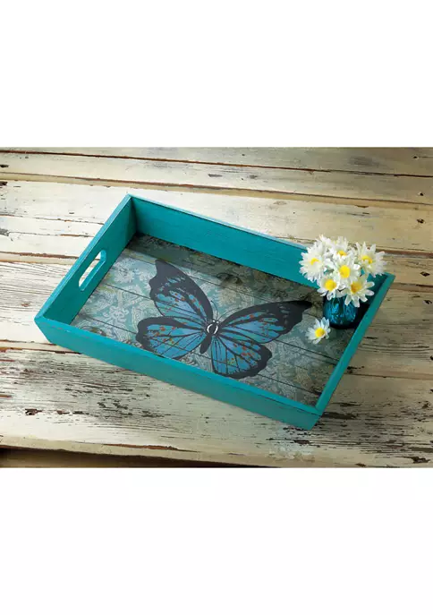 Brighten up your home with this tray that is both a beautifully crafted and functional home dΓ©cor piece. Lightweight and sturdy, this tray can easily store and/or display your important items being both stunning and practical. Great as a gift for friends or yourself, this tray will perfectly compliment your home for years to come. The tray weighs 1.2 lbs. and measures 16 inches by 12.25 inches by 2 inches. Made of firwood and MDF wood to create beautifully durable and detailed dΓ©cor. This gorgeous tray is the perfect combination of style and storage. Great as a hallway embellishment, functional bathroom dΓ©cor, or statement living room piece, this tray is both stunning and versatile. To clean your lovely tray, dust lightly or wipe with damp cloth as needed. Wow your guests when you serve snacks and drinks on this gorgeous tray. This wooden tray features a weathered finish and a blue butterfly design. The walls of the tray are finished in blue and feature easy-grip cutout handles. Also useable to display jewelry or decor items. Even leave it empty to show off the beautiful butterfly.
