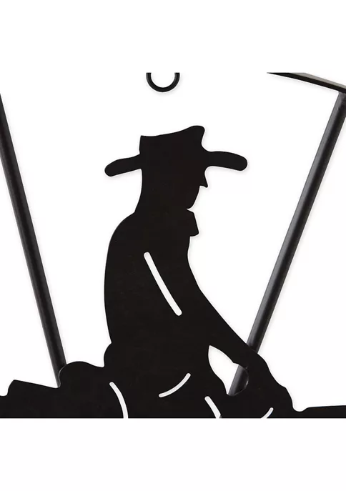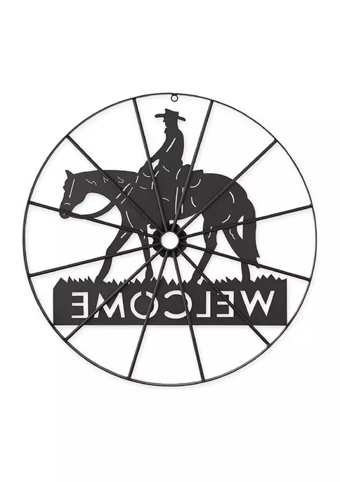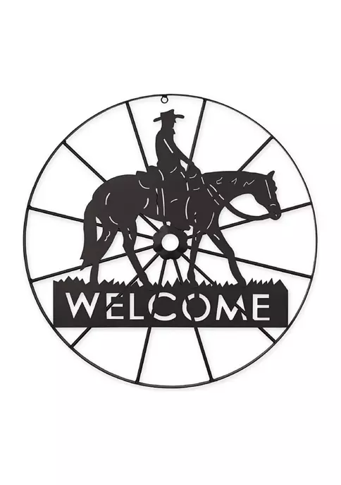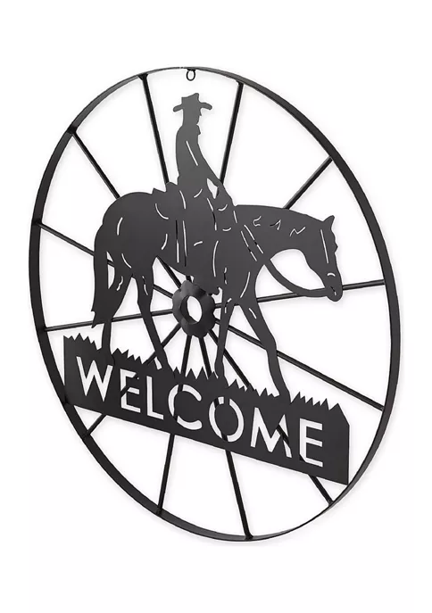 Decorate your home indoor or out with this welcome sign! Use it to spruce up your garden, light up a pathway, accompany a vegetable patch, brighten up a patio, or even to adorn a sunny shelf. An amazing housewarming gift, this sign will light up any home and garden space with cheer and whimsy! This home decor weighs 3.0 lbs. and measures 23.75 inches by 0.75 inches by 23.75 inches. Made of iron to create beautifully detailed garden dΓ©cor. A sweet addition to your front or backyard garden, this statue will make your outdoor space feel instantly more inviting. Place near a pond, fountain, flower or vegetable garden to light up your space! To clean your garden ornament, dust lightly or wipe with a damp cloth as needed. Welcome your guests into your home with this Western-inspired sign. This ranch-ready wall decor features a wagon wheel design, silhouettes of a cowboy upon his trusty steed, and the word “welcome” in the grass below the horse’s hooves.