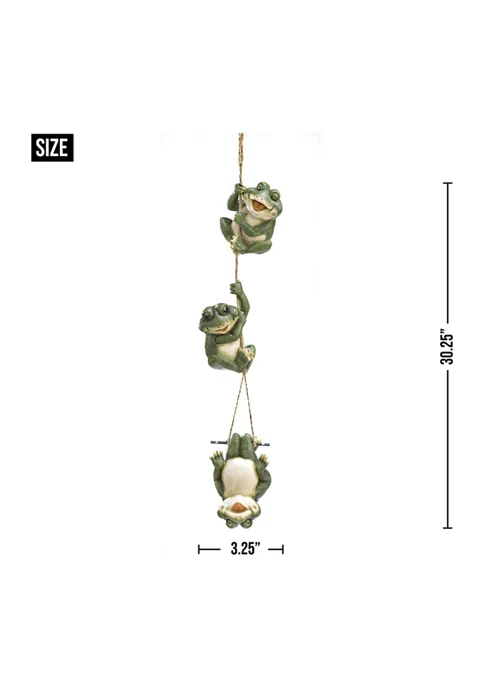 Spruce up your home indoor or out with this cute decor. Use it to enhance your garden, accompany a vegetable patch, brighten up a patio, or even to adorn a sunny shelf. An amazing housewarming gift, this statue will light up any home and garden space with cheer and whimsy. The garden decor weighs 1.1 lbs. and measures 3.25x3x30.25 inches. Made of polyresin and polystone to create beautifully durable and detailed decor. A sweet addition to your home, this statue will make your indoor or outdoor space feel instantly more inviting. Place by a pond, vegetable garden, or bookshelf to add a touch of whimsical decor. To clean your dΓ©cor, dust lightly or wipe with a damp cloth as needed. A giggling trio of amphibious acrobats enjoys a merry moment of mirth, playfully tumbling down the length of a free-swinging rope. An utterly irresistible hanging sculpture that brings loads of love and laughter to your garden.