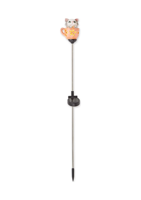 Decorate your home indoor or out with this solar light stake! Use it to spruce up your garden, light up a pathway, accompany a vegetable patch, brighten up a patio, or even to adorn a sunny shelf. An amazing housewarming gift, this stake will light up any home and garden space with cheer and whimsy! Little kitty in a cup weighs 0.4 lbs. and measures 4×3.5×30.5 inches. Made of durable polyresin, plastic, iron, solar panel to create beautifully detailed dΓ©cor. A sweet addition to your front or backyard garden, this garden dΓ©cor will make your outdoor space feel instantly more inviting. Place near a pond, fountain, flower or vegetable garden and the solar light will provide a soft glow at night. To clean your garden ornament, dust lightly or wipe with a damp cloth as needed. This outdoor solar garden stake both illuminates your garden at night and acts as beautiful daytime yard art. Simply stick the stake into the soil and allow the solar panel to work its lighting magic!