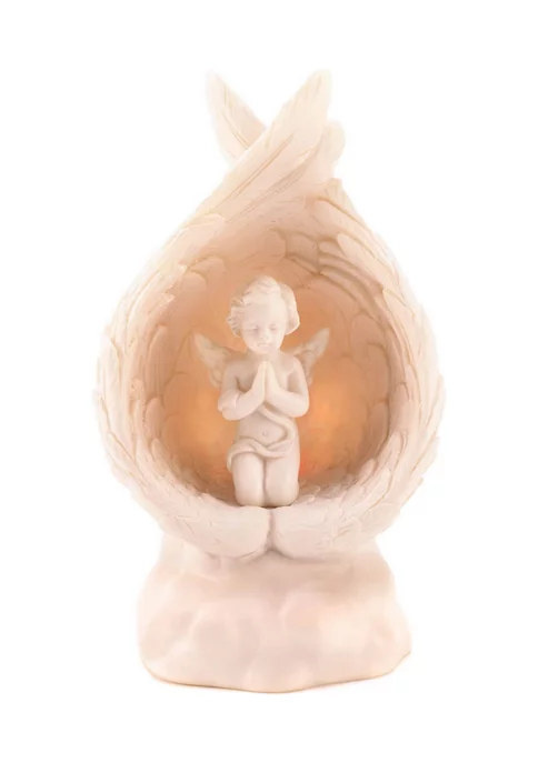 Perfect gift for a memorial, first communion, confirmation or any sacred ceremony, this figurine serves as both home dΓ©cor and an expression of faith. Used to adorn a shelf, prayer table, desk, or garden, this graceful angel will bestow a sense of compassion and devotion to your home. A one of a kind figurine meant to last a lifetime! Light-Up Praying Angel Figurine weighs 0.2 lbs. and measures 2.25×2.87×4.87 inches. Made from durable and detailed Polyresin and LED lights to capture the statue’s subtle beauty. and cast a heavenly glow. Unique spiritual home dΓ©cor or the perfect gift for any sacred ceremony, this figurine exudes a sense of faith and devotion that will permeate any space. Wipe with a dry/damp cloth or dust lightly to maintain the figurine’s refined splendor. Sheltered inside a pair of folded wings, this little cherub kneels in prayer as all around, soft lights bestow a rapturous glow. Can be used as elegant home dΓ©cor or as a spiritual presence on any prayer table.