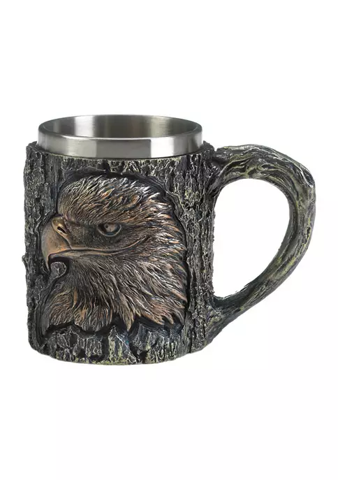 Decorate your home indoor or out with this sophisticated statue! Use as a table centerpiece, shelf ornament, or to class up your living room, this piece will add an air of elegance to any space. An amazing housewarming gift, this model will fill any home with style and regality! This home decor weighs 1.0 lbs. and measures 6 inches by 3.75 inches by 4.5 inches. Made of polyresin and stainless steel to create a beautifully detailed sculpture. Class up your home with this exquisite piece! Place on your fireplace mantel, a shelf, or a tabletop surface to as a stylish and sophisticated display model. To clean your dΓ©cor, dust lightly or wipe with a damp cloth as needed. This handsome stainless steel eagle mug will pair up nicely with our eagle Wine Bottle Holder. With a sharply focused gaze, this eagle stands out on the textured tree bark background. It makes a great gift for family and friends who love eagles! The stainless steel inner liner keeps your drink cool or hot. Hand wash only.