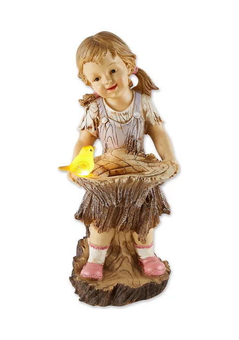 Decorate your home indoor or out with this solar light statue! Use it to spruce up your garden, light up a pathway, accompany a vegetable patch, brighten up a patio, or even to adorn a sunny shelf. An amazing housewarming gift, this statue will light up any home and garden space with cheer and whimsy! This statue weighs 2.5 lbs. and measures 6×5.5×14.5 inches. Made of durable polyresin and a solar panel to create a beautifully detailed sculpture. A sweet addition to your front or backyard garden, this statue will make your outdoor space feel instantly more inviting. Place near a pond, fountain, flower or vegetable garden and the solar light will provide a soft glow at night. To clean your statue, dust lightly or wipe with a damp cloth as needed. A rosy-cheeked girl and her friendly feathered companion get ready to gather a summer bouquet. Lovingly fashioned to resemble hand carved wood; a special hidden solar light provides a lovely after-dark glow. This adorable solar statue is a great addition to your front walk, garden, or patio.