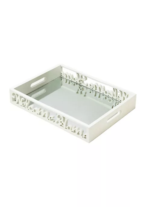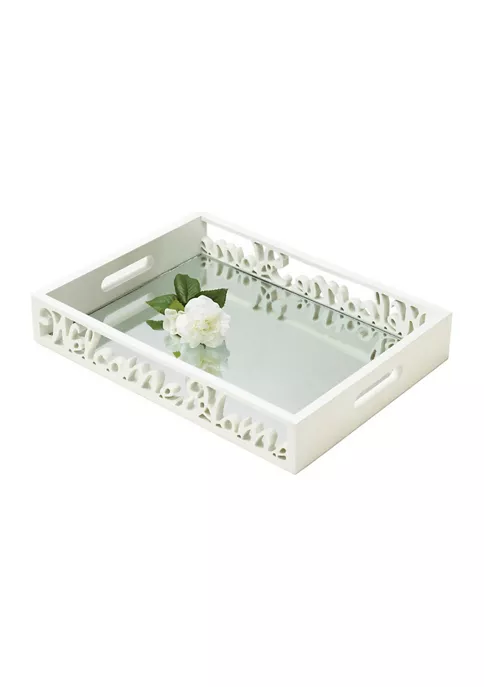 Brighten up your home with this reflective mirror tray that is both a beautifully crafted and functional home dΓ©cor piece. Lightweight and sturdy, this mirror can easily store and/or display your important items being both stunning and practical. Great as a gift for friends or yourself, this mirror tray will perfectly compliment your home for years to come. The mirror weighs 3.8 lbs. and measures 15.75 inches by 12 inches by 2.5 inches. Made from durable pine wood and MDF wood to create a home dΓ©cor piece that reflects your amazing design style. This gorgeous mirror tray is the perfect combination of style and storage. Great as a hallway embellishment, functional bathroom dΓ©cor, or statement living room piece, this mirror tray is both stunning and versatile. To clean your beautiful mirror, dust lightly or wipe with damp cloth as needed. It’s so nice to be welcomed home with style. This charming tray’s wooden frame is carved with “Welcome Home” in beautiful script. The interior is mirrored for an extra splash of style, and it features two carrying handles for easy transport. A great housewarming gift or personal home dΓ©cor piece!